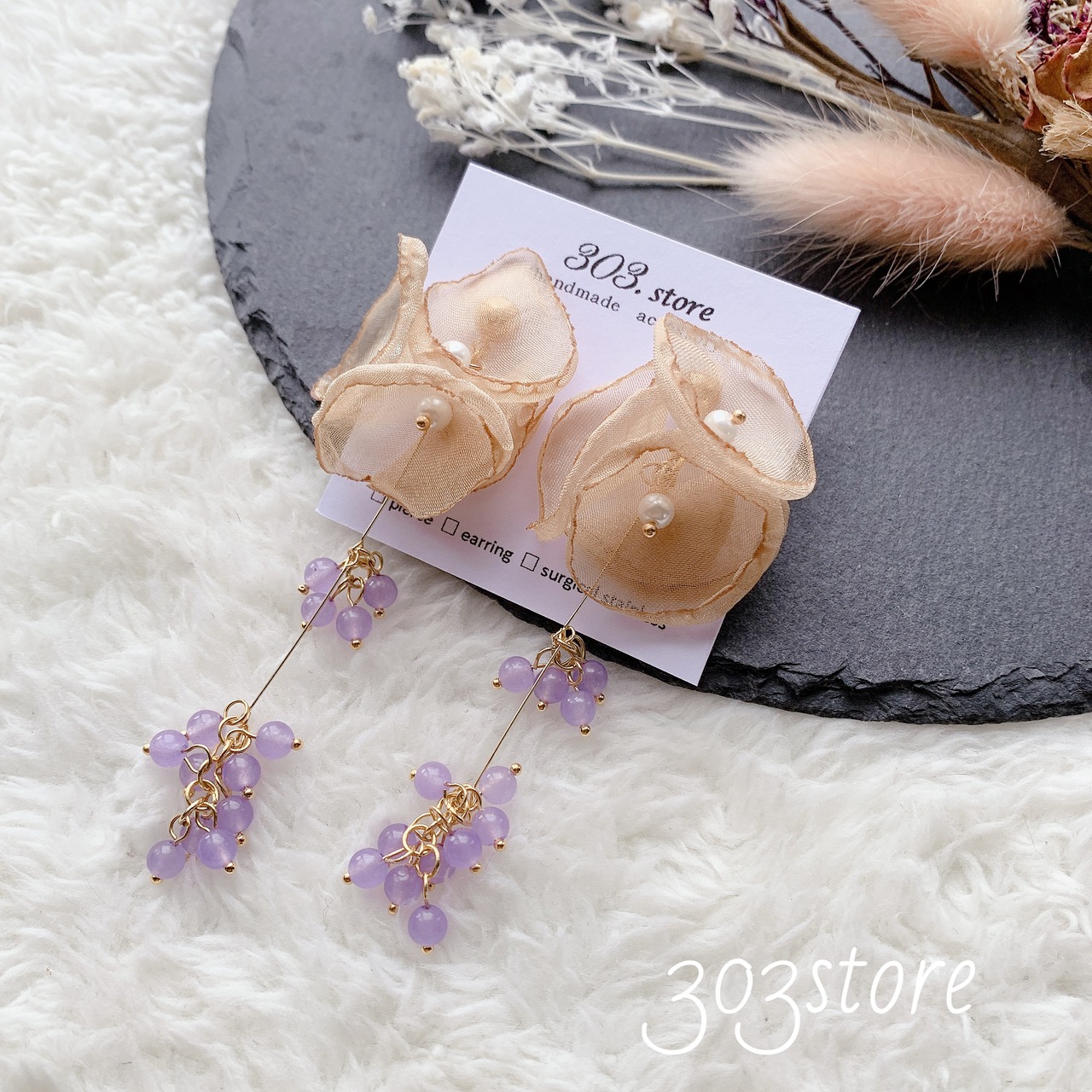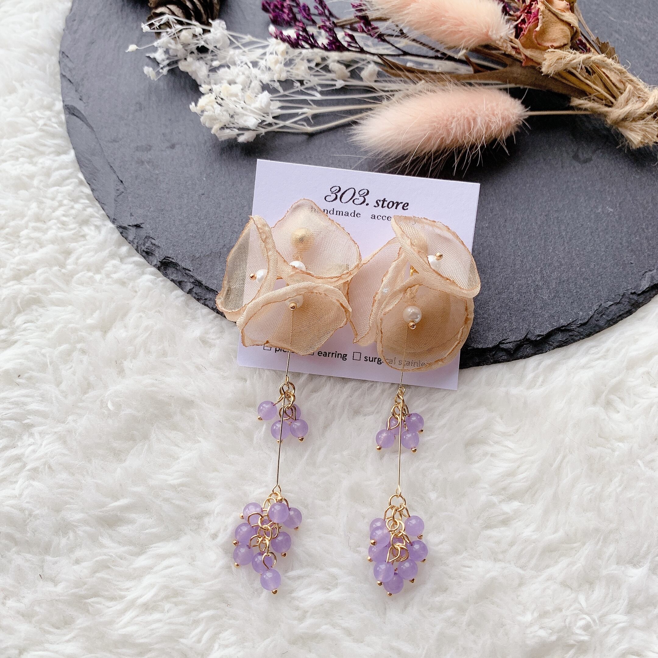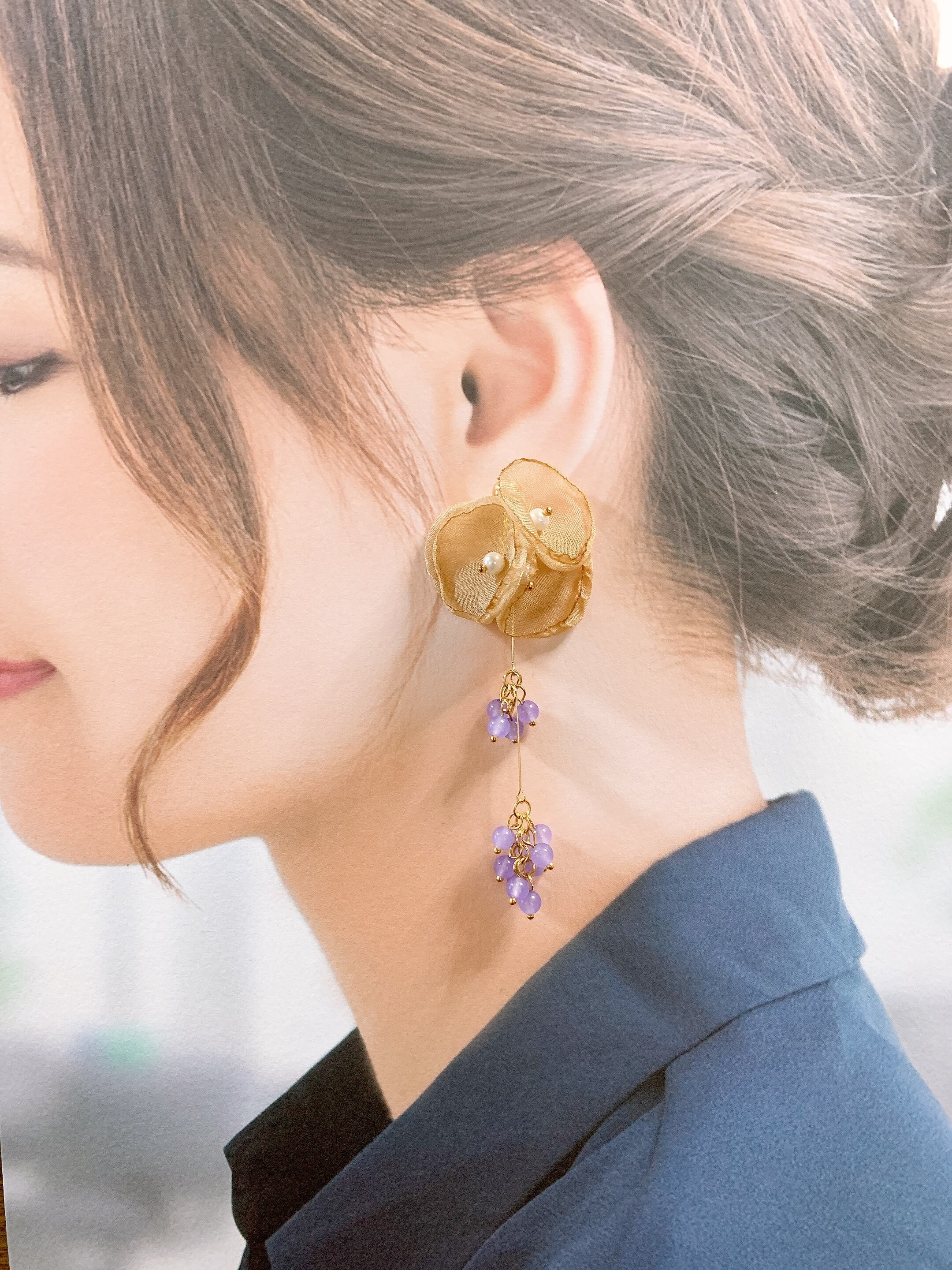 ふわふわ柔らかなオーガンジーを使ったボリューム感あるピアスです。