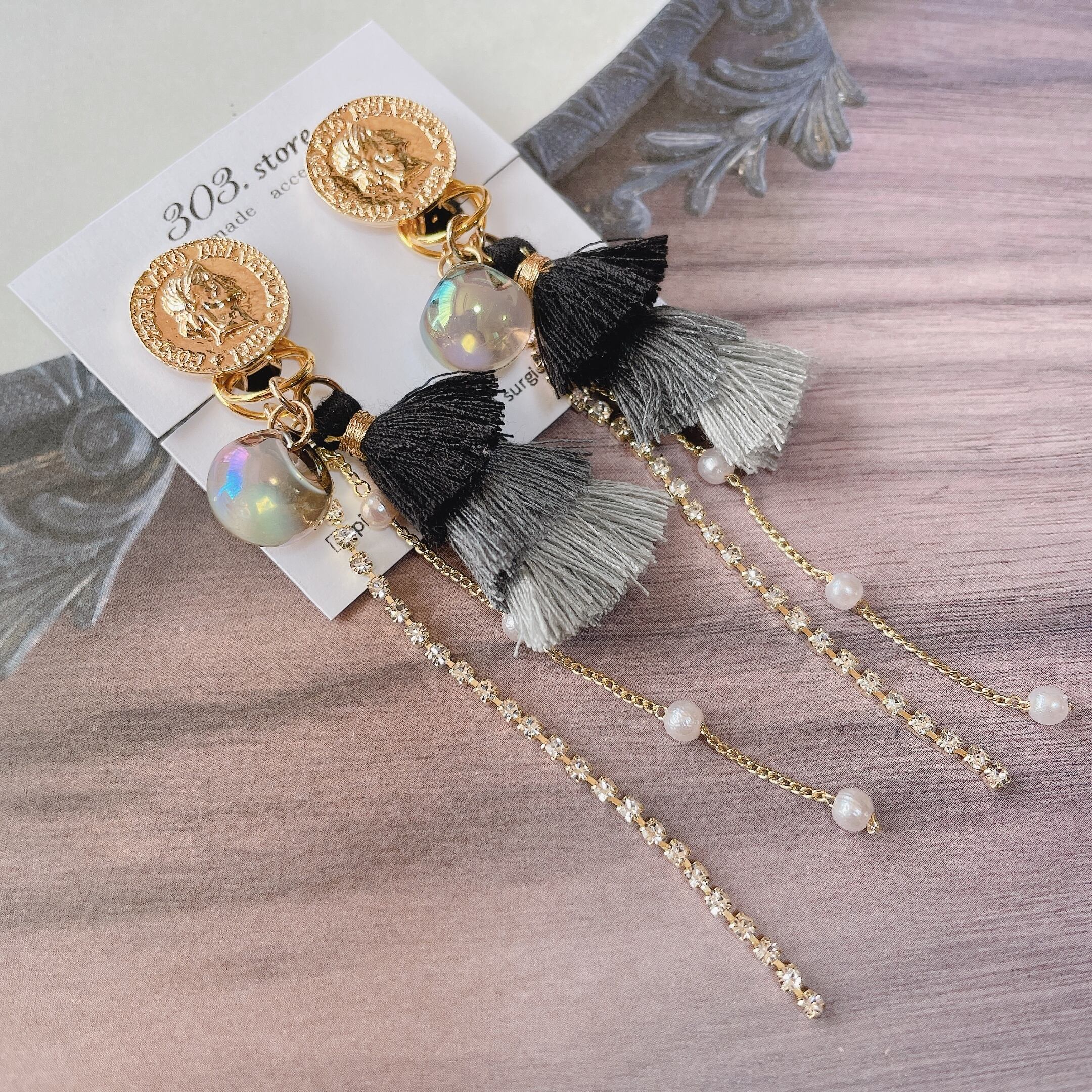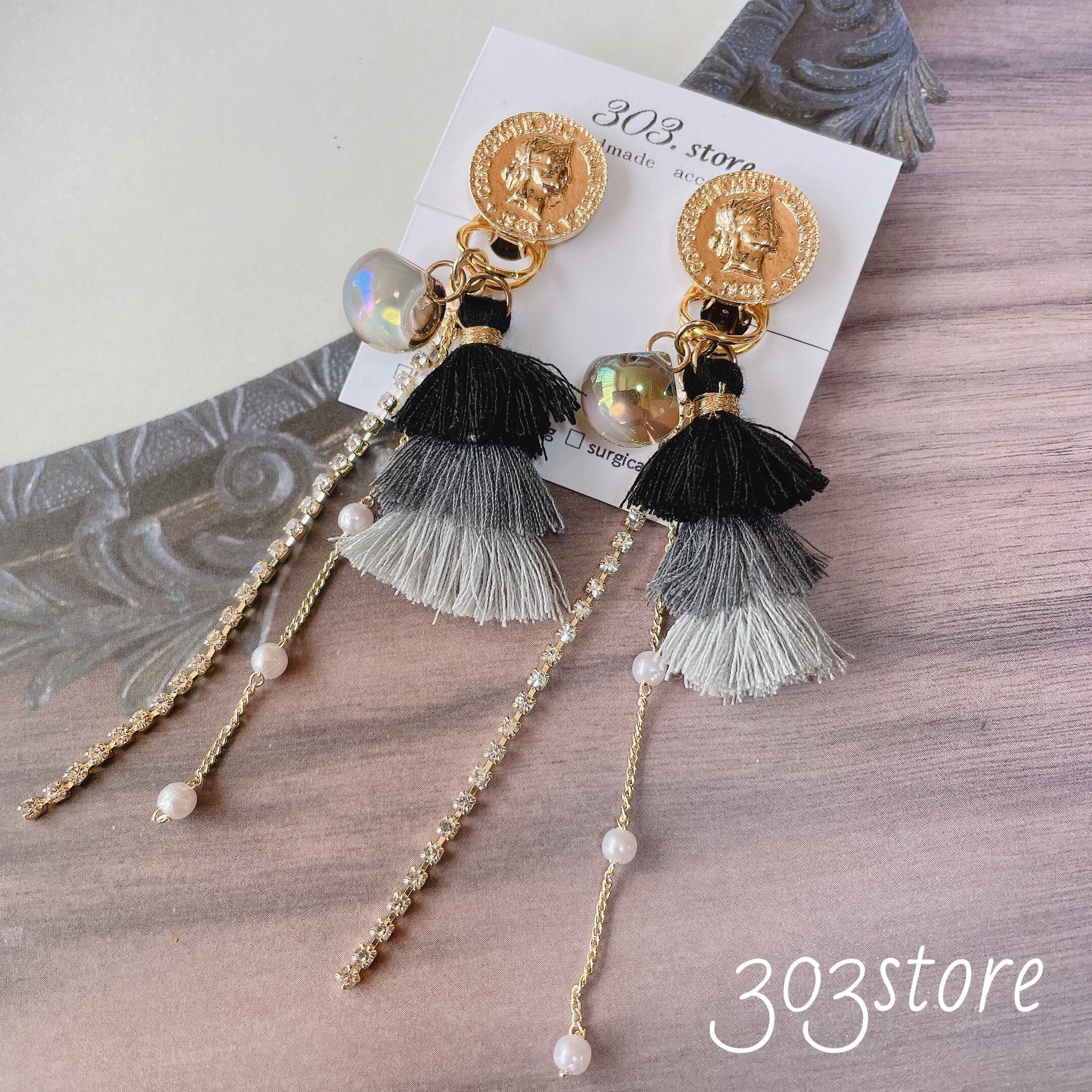 3色のタッセルが3段積み重なったデザインのイヤリングです!