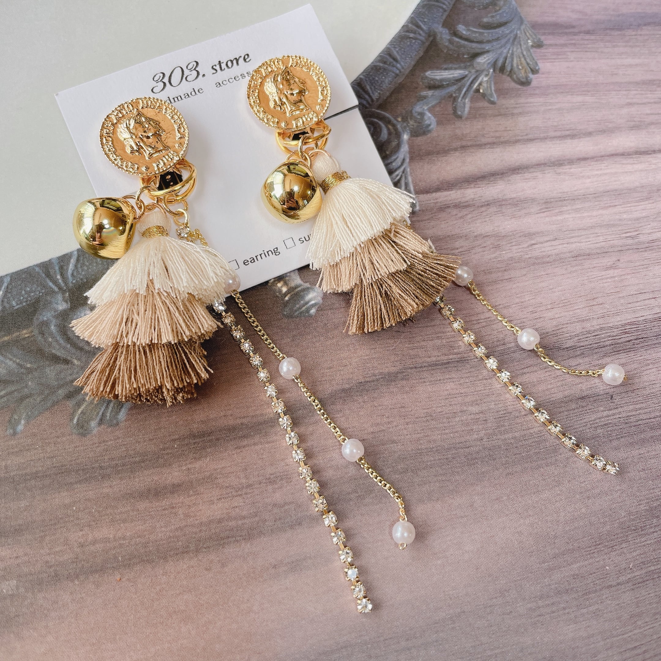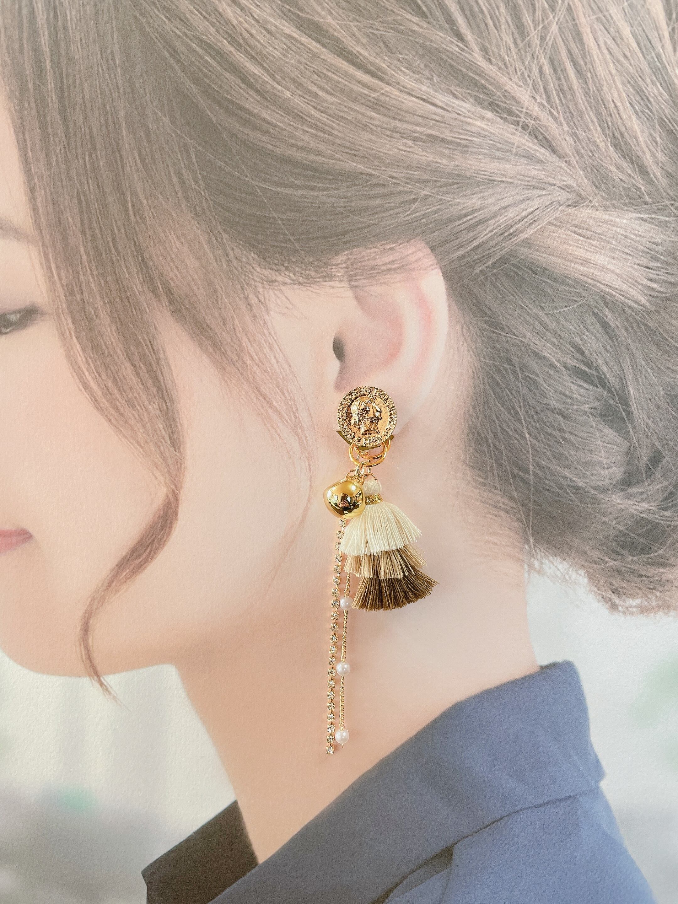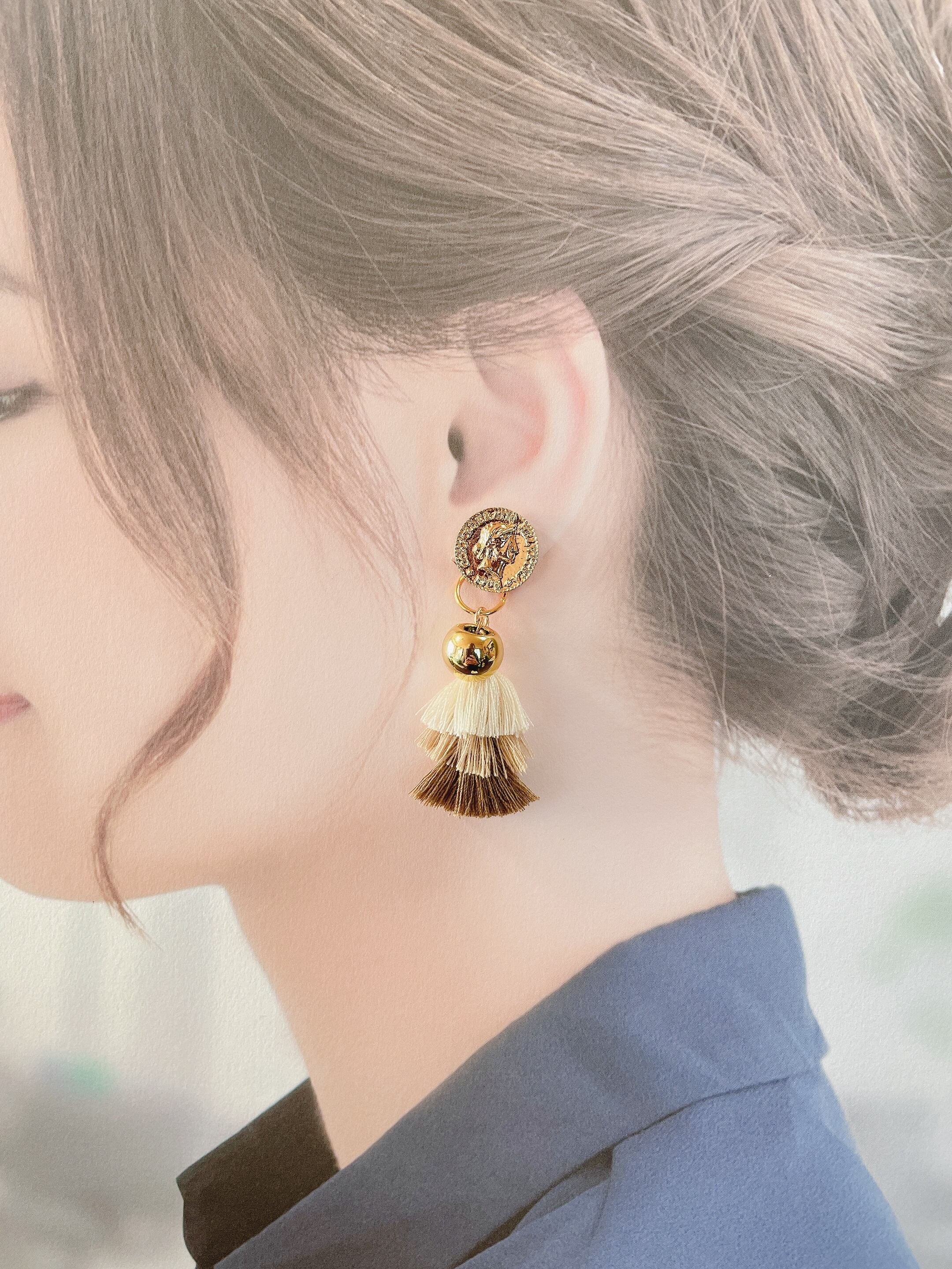 3色のタッセルが3段積み重なったデザインのイヤリングです!