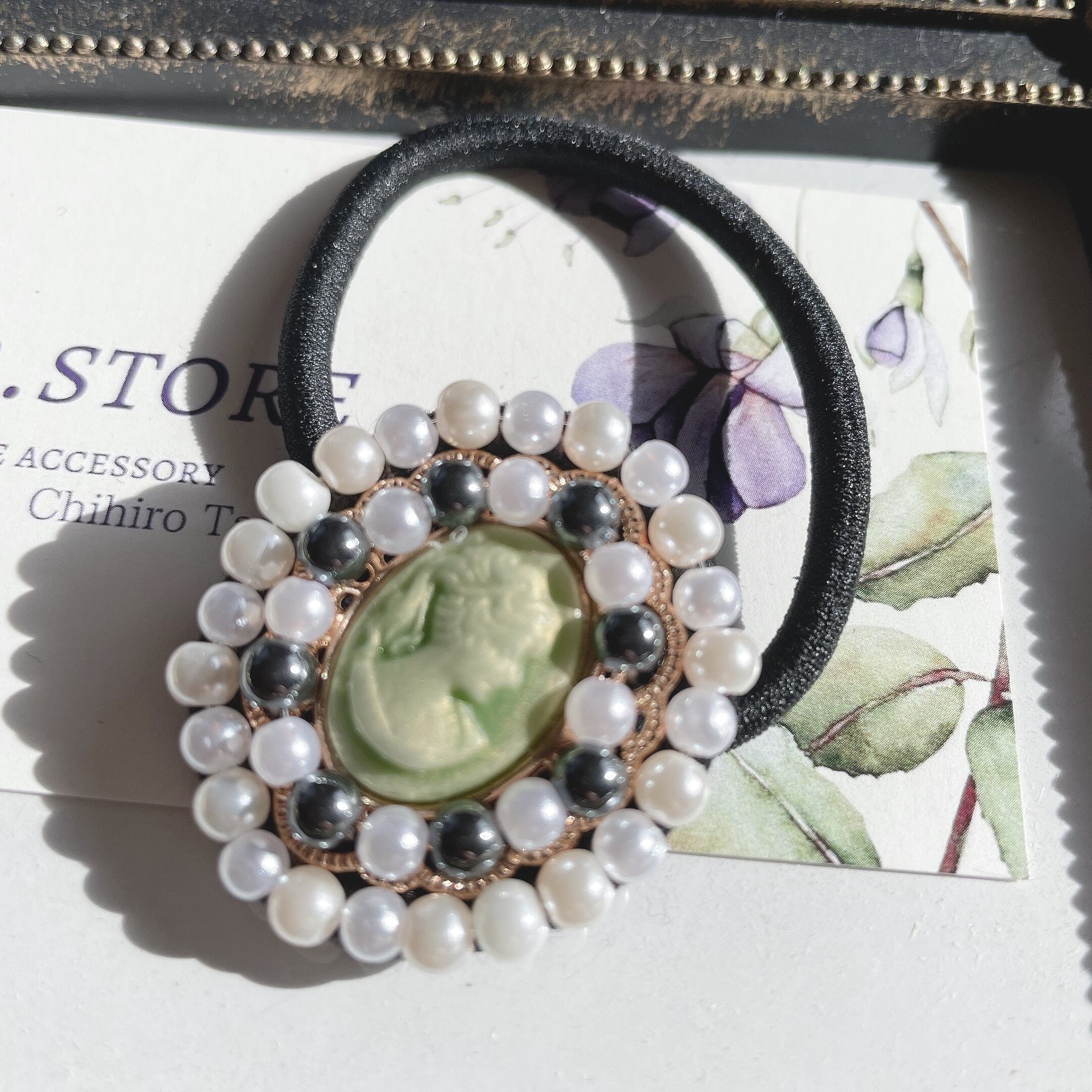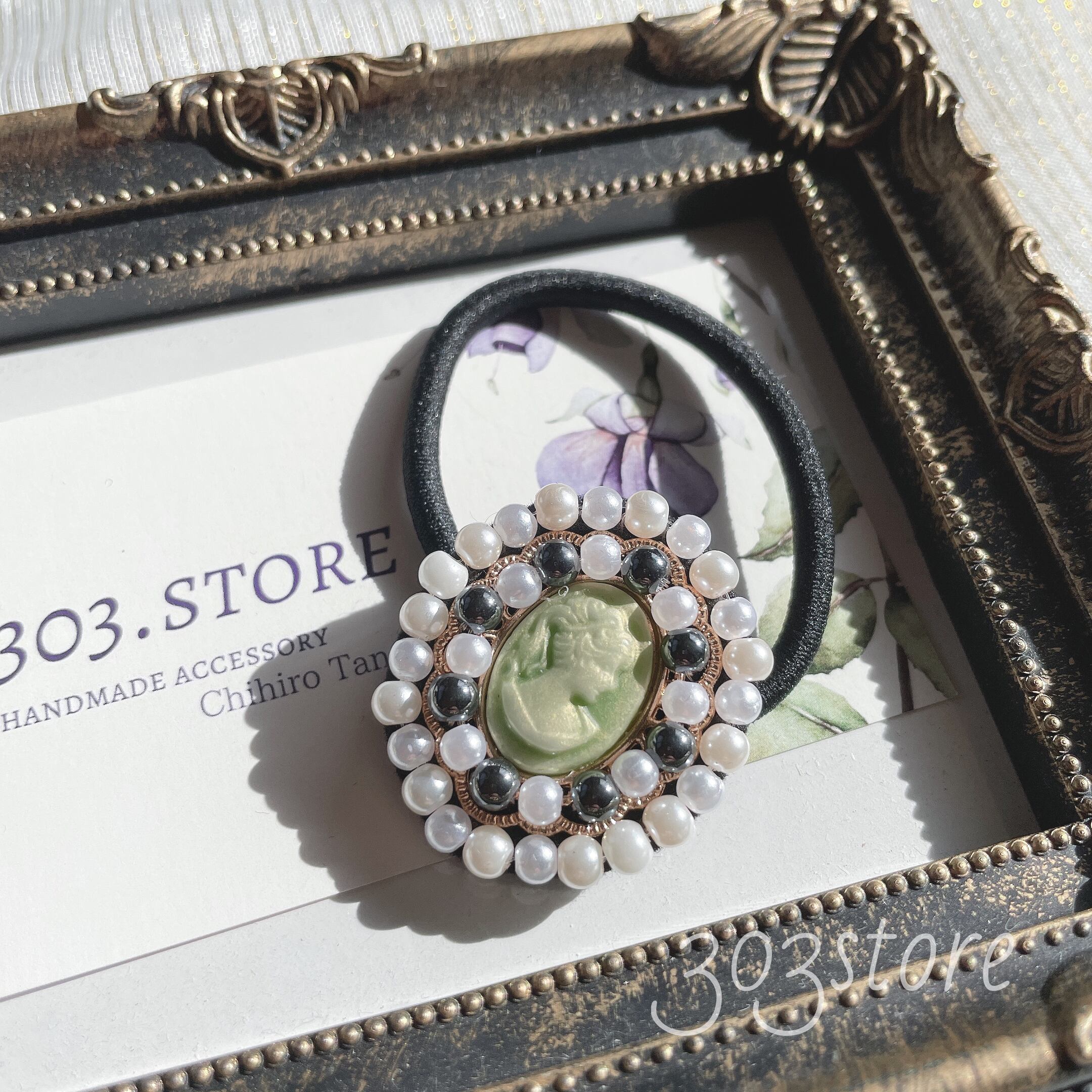ガラスパールビーズでひとつひとつ刺繍したヘアゴムです。