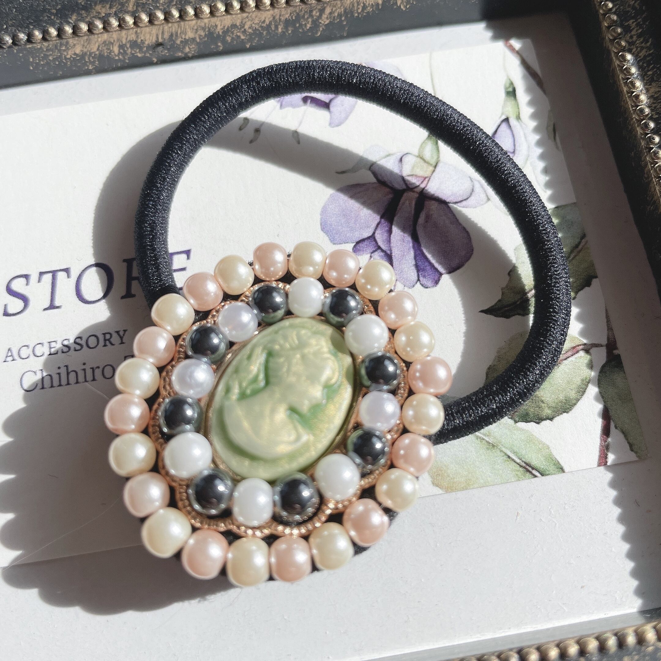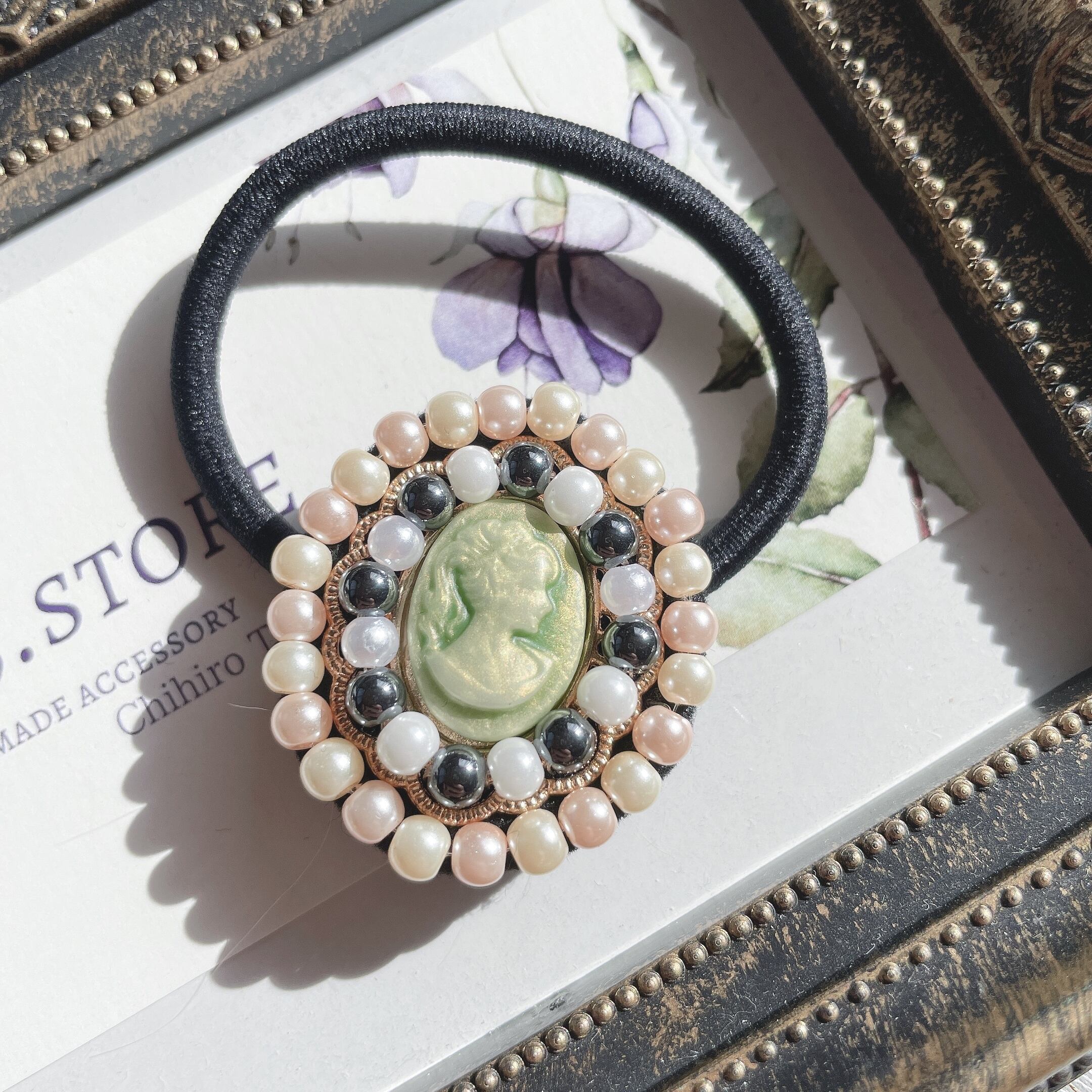 ガラスパールビーズでひとつひとつ刺繍したヘアゴムです。