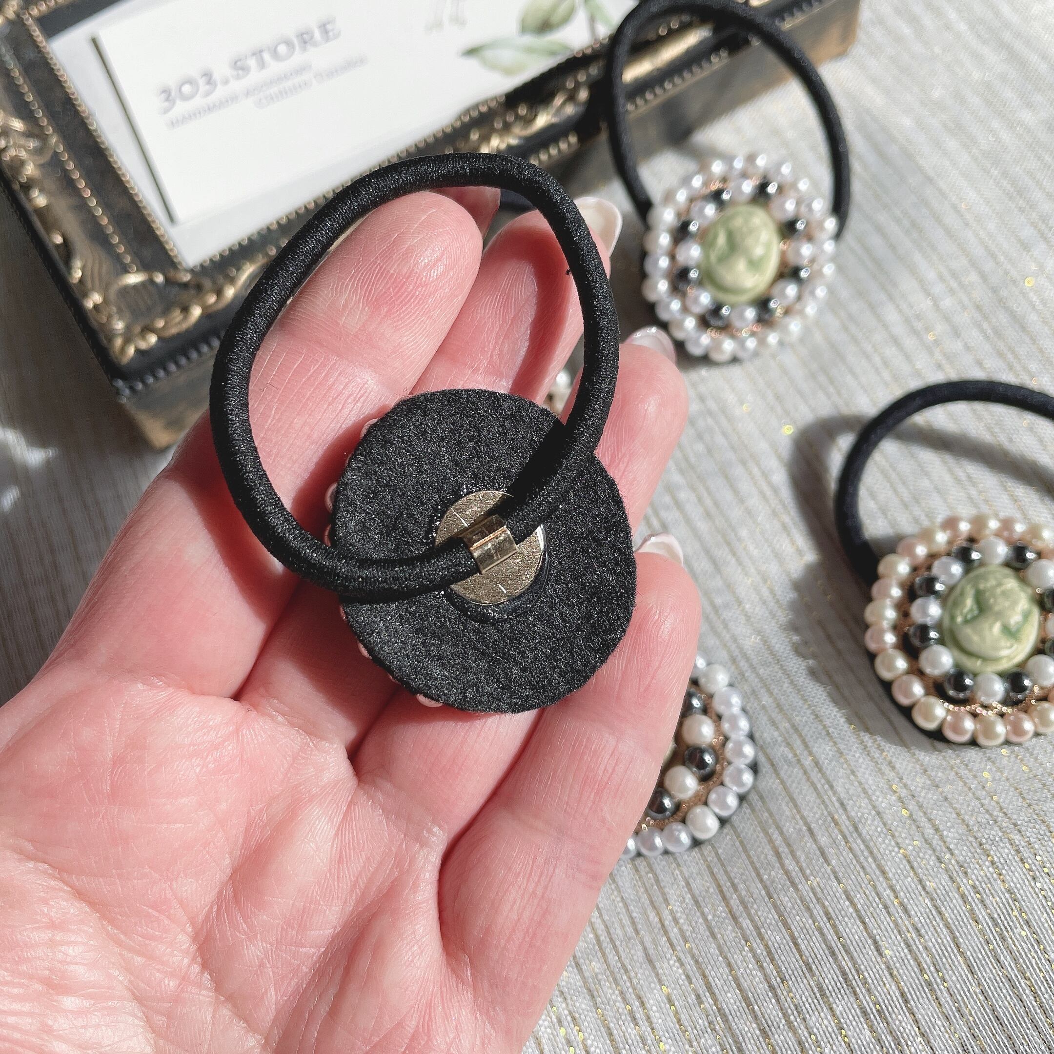 ガラスパールビーズでひとつひとつ刺繍したヘアゴムです。