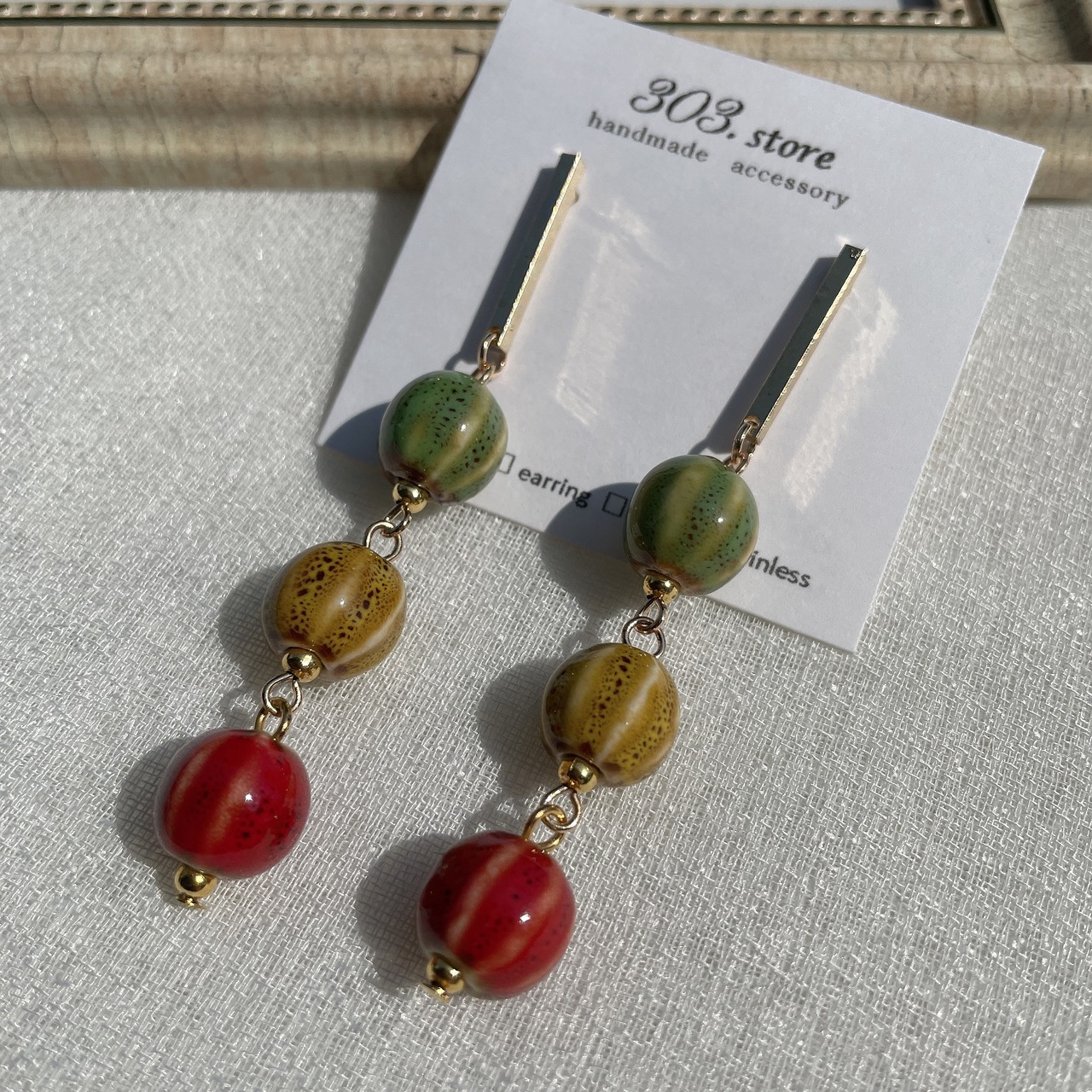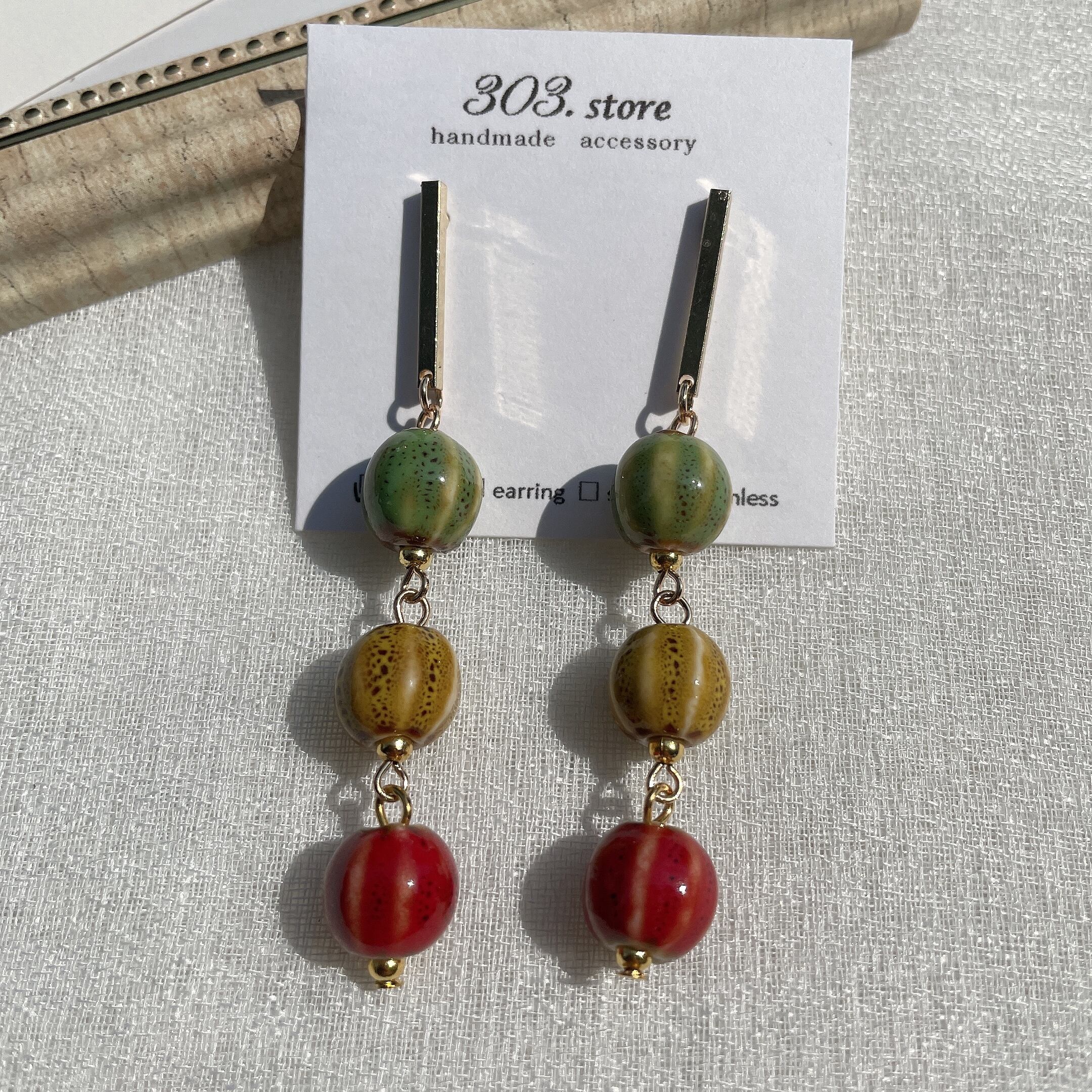 赤・緑・黄色のカラフル陶器ビーズを使ったピアスです。