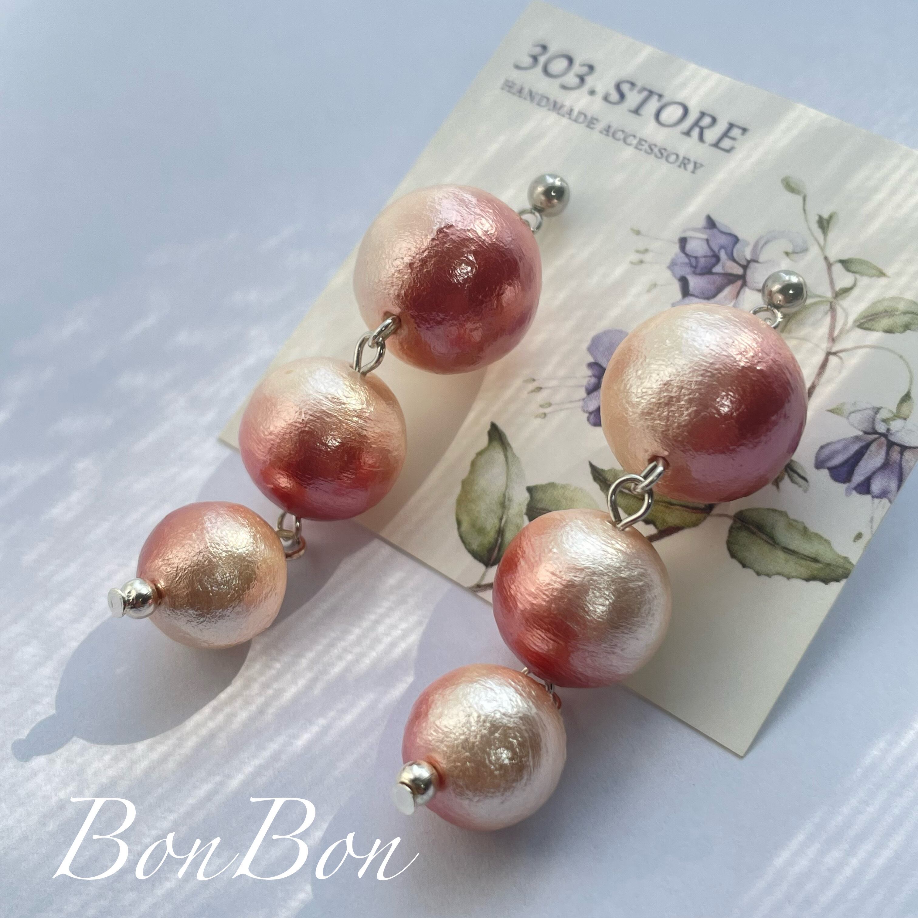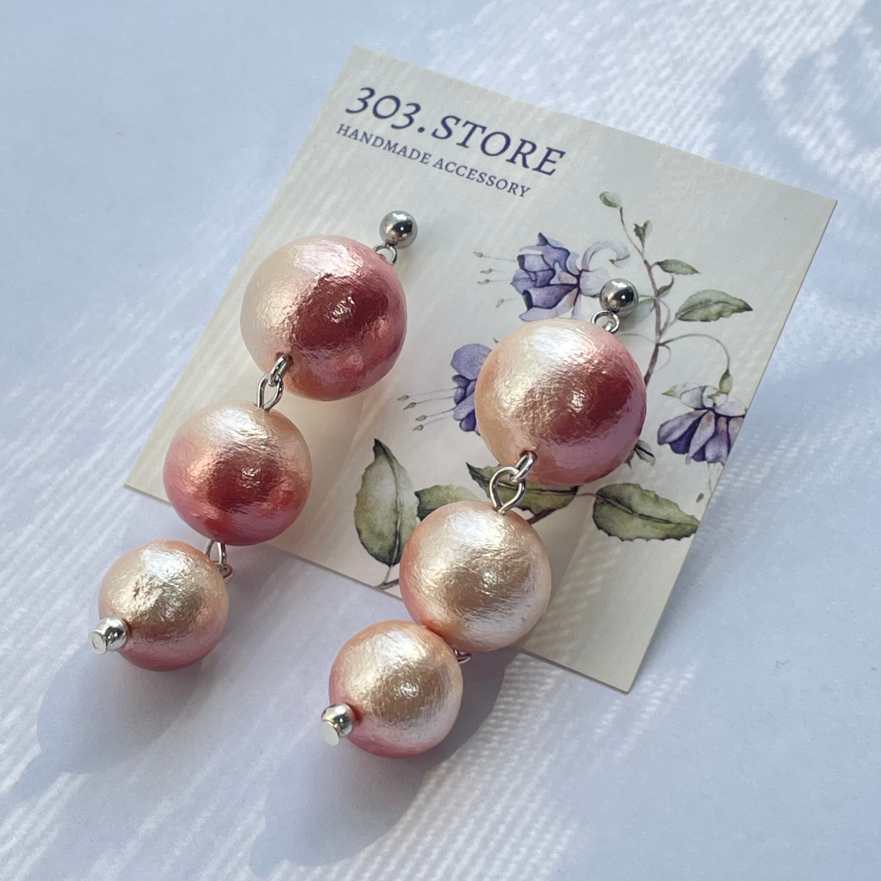上から16mm、14mm、12mmのコットンパールを使った3連ピアスです。