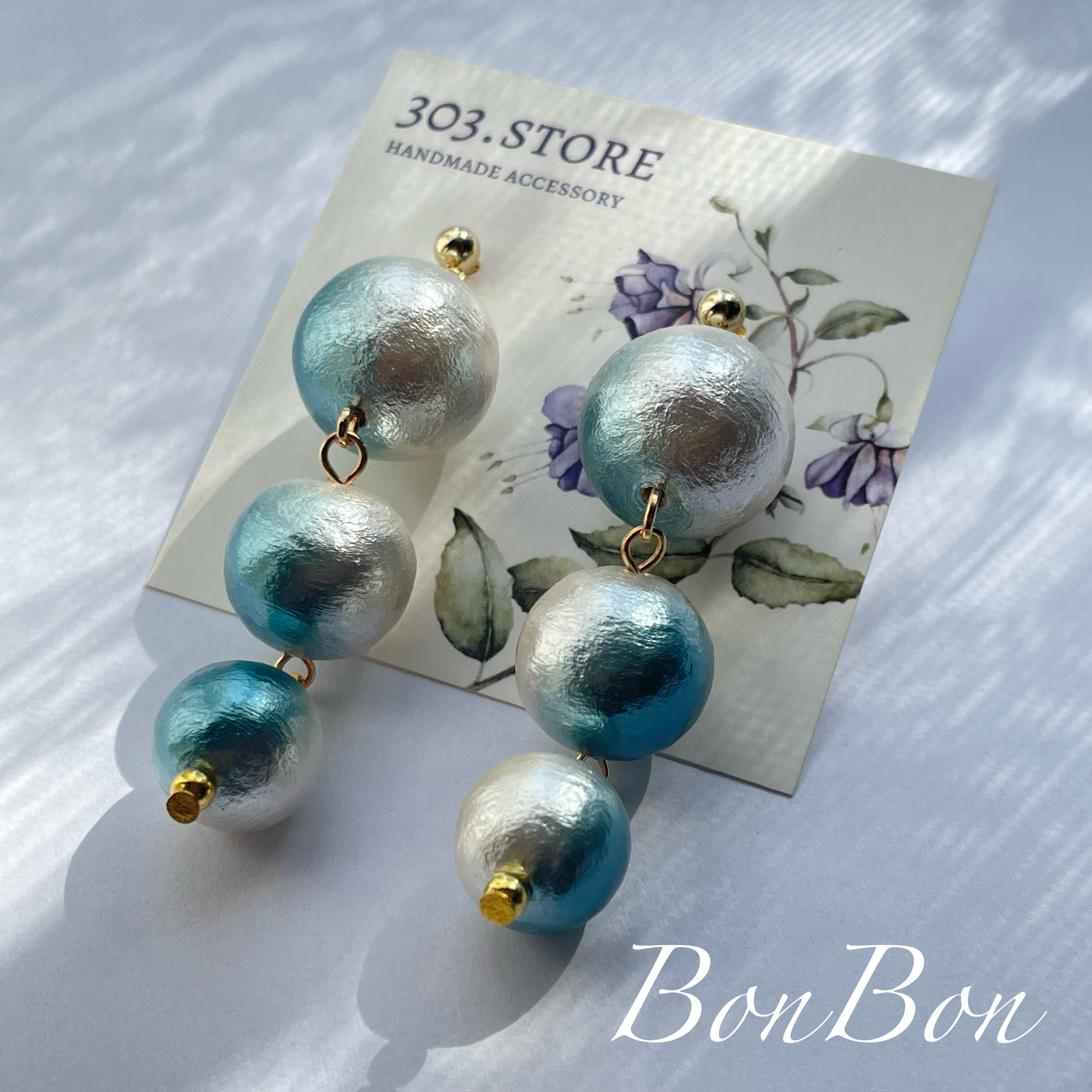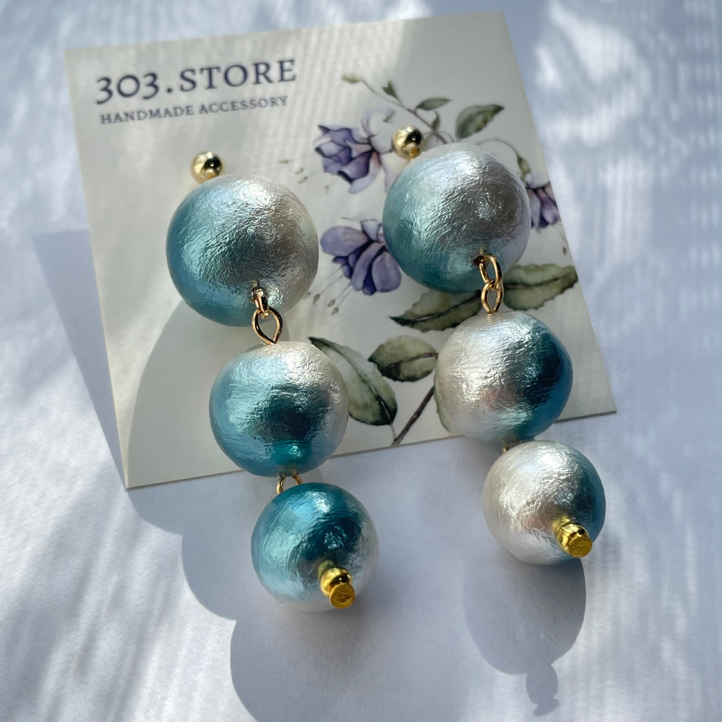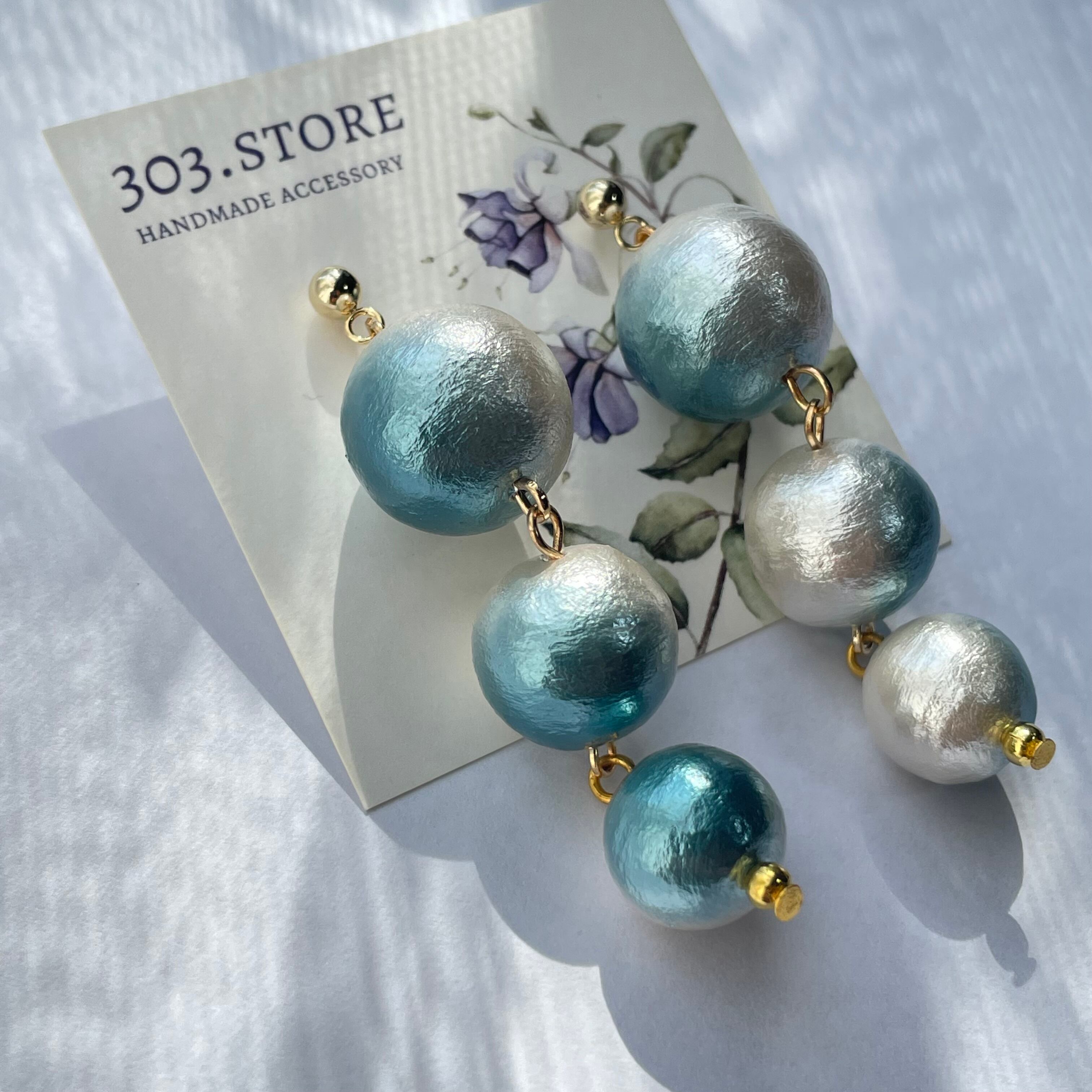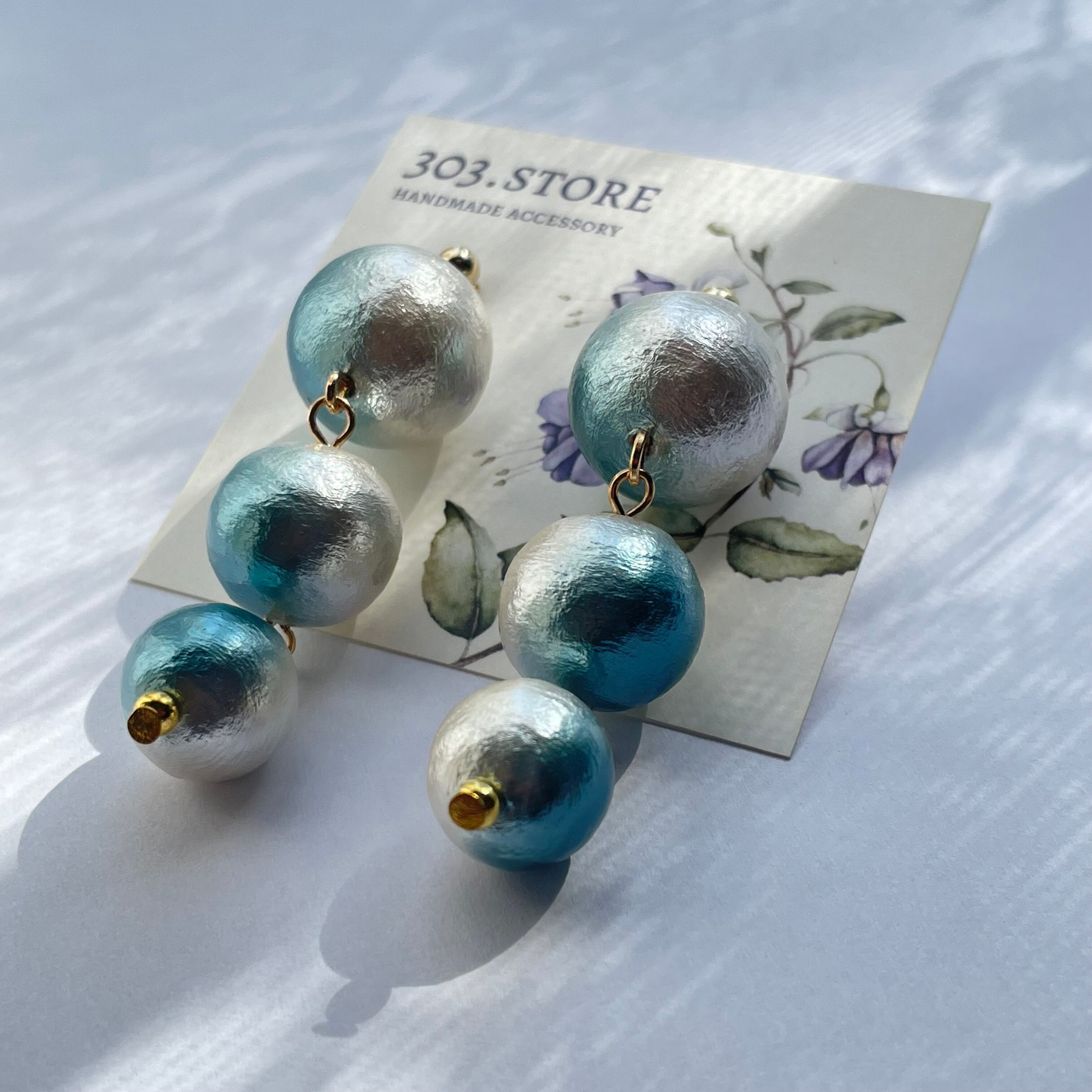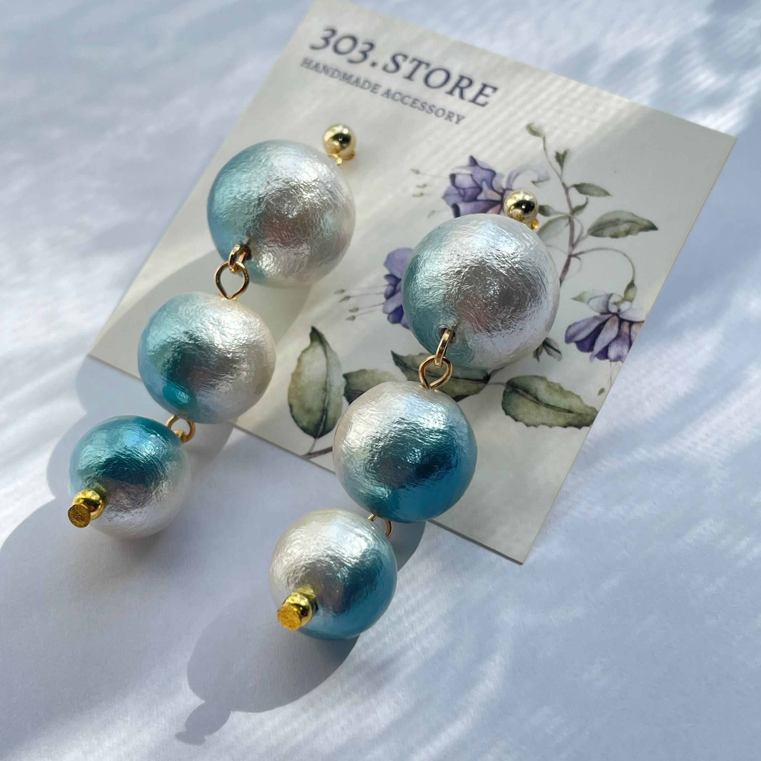 上から16mm、14mm、12mmのコットンパールを使った3連ピアスです。
